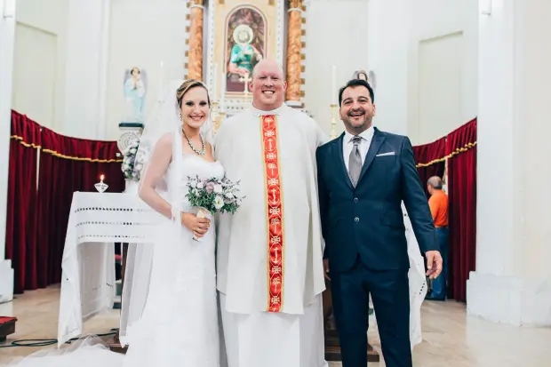 Laura (formerly Ross), a third-generation Italian American, was raised one parish over from the future Fr. Hoffa. The two met when Laura traveled to the 2002 World Youth Day in Toronto with a group the young man was helping lead. They became friends and stayed in touch over the years. Knowing Allen had gone to seminary and was ordained, Laura reached out to now-Fr. Hoffa after she and Pino were engaged. Not only did he lead their marriage prep, but also concelebrated their intimate 2015 wedding in the small parish church in Pino’s hometown parish in Calabria.