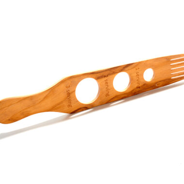 Portion out pasta for your eaters and gently stir it as it boils with this clever, carved from Mediterranean olivewood spaghetti measure fork.